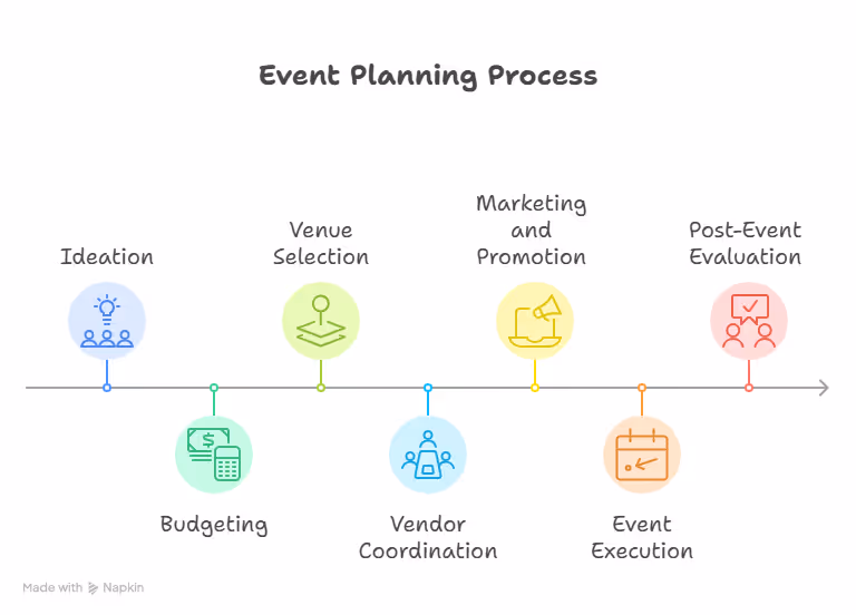 - Ideation: The first step is defining the event's purpose and goals. This sets the foundation for the entire planning process, ensuring all decisions align with the desired outcome.
